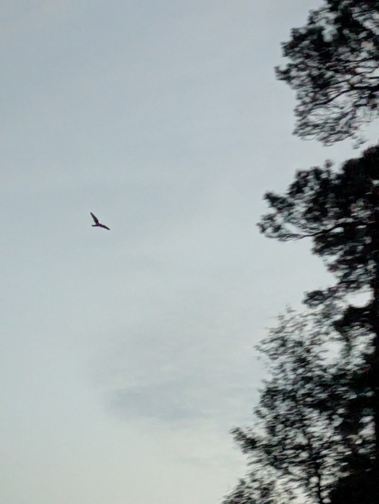 The nightjars come in the last of the light. Overhead, high by the pines behind, flying on flat, paper plane wings until they flap, stiffly. A pair swing around in front, clipping the seam of the dark horizon, pulling up into the last of the light in the sky. Against the sky they resemble a pared down kestrel – same rough shape but reduced to the essentials, as if just bone and feather magicked to life. They dart into the pine, slipping between the black branches. Periodically they settle, perching, disappearing black on black, but for the big-headed outline. The pair come and go. Flitting until the light dissolves to dark.